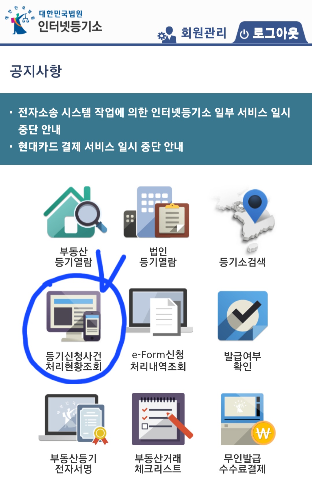 등기신청사건 처리현황 조회 아이콘을 누름니다.